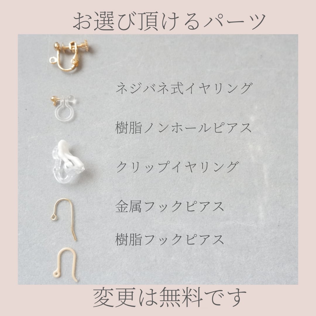 ネジバネ式イヤリング、樹脂ノンホールピアス、クリップイヤリング、金属フックピアス、樹脂フックピアスの中からパーツを選択欄からお選び下さい。
