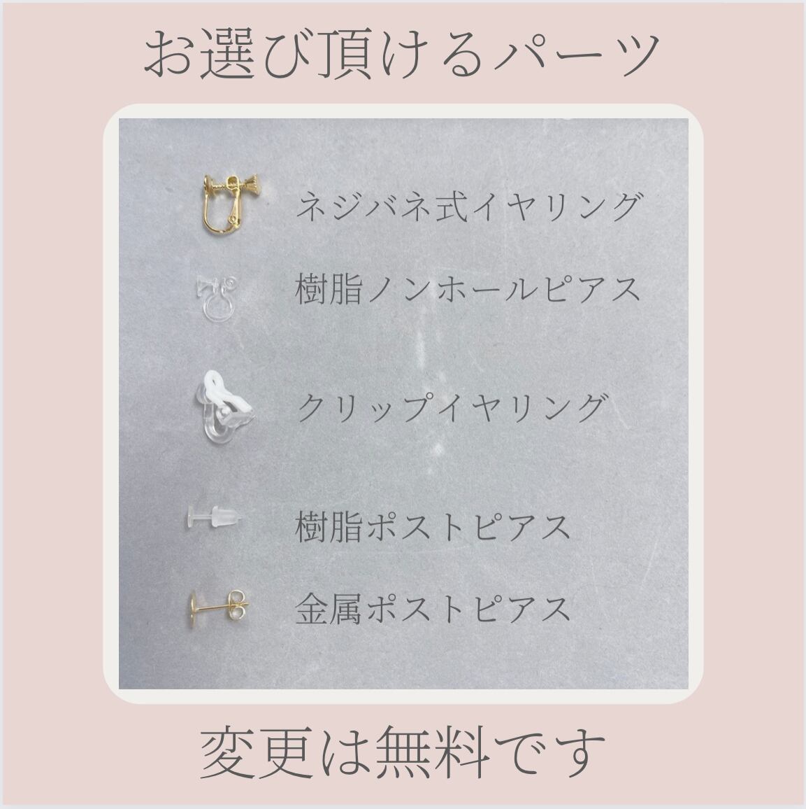 ネジバネ式イヤリング、樹脂ノンホールピアス、、クリップイヤリング、金属ポストピアス、樹脂ポストピアスからパーツがお選び頂けます。