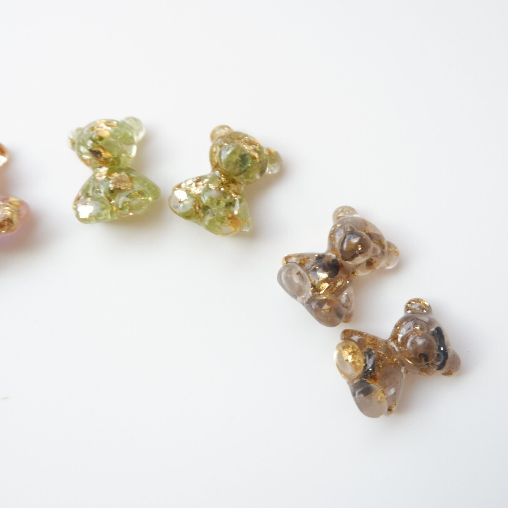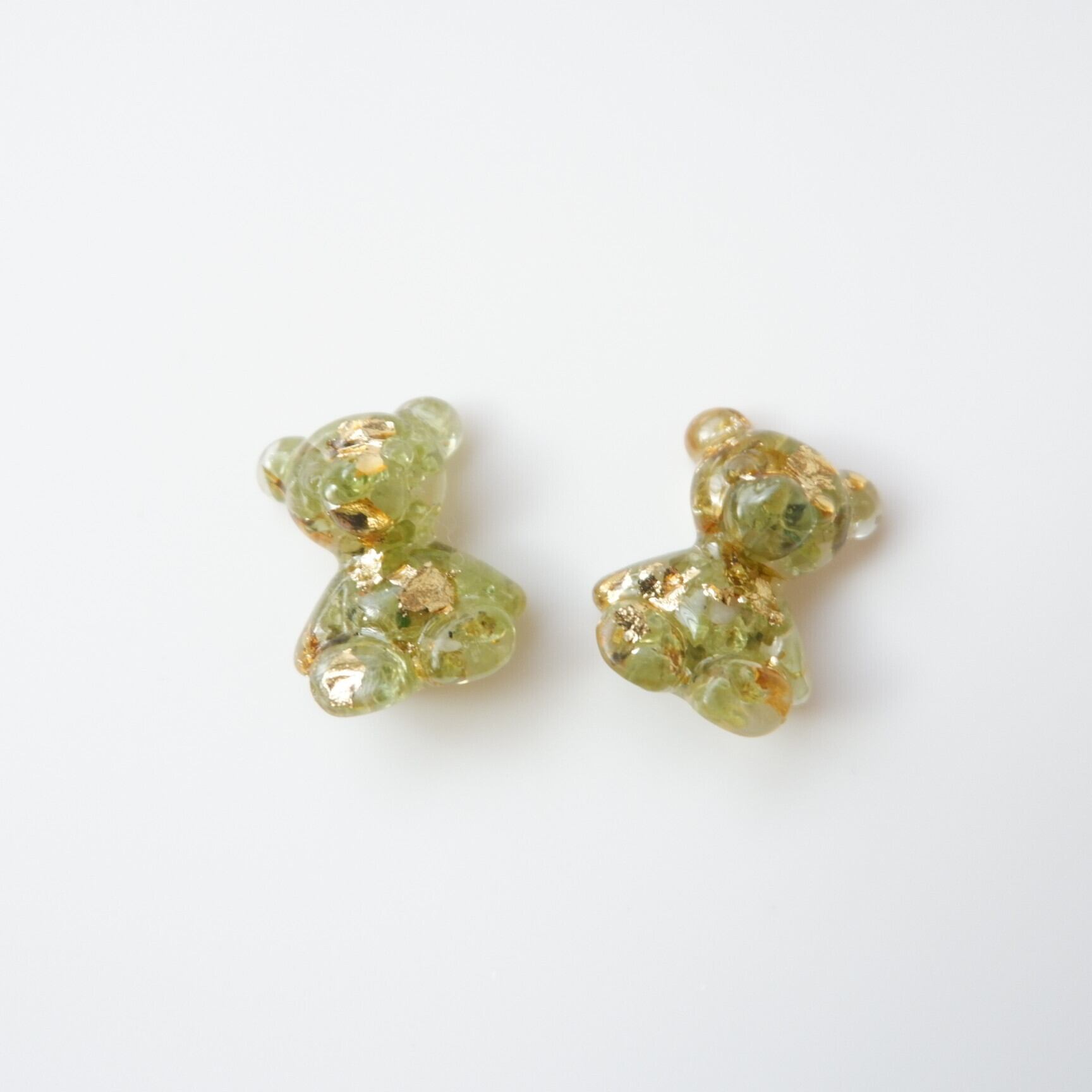 天然石のペリドットのさざれと金箔を「ゆめくまちゃん」に閉じ込めた大人女性のためのクマアクセサリーです。