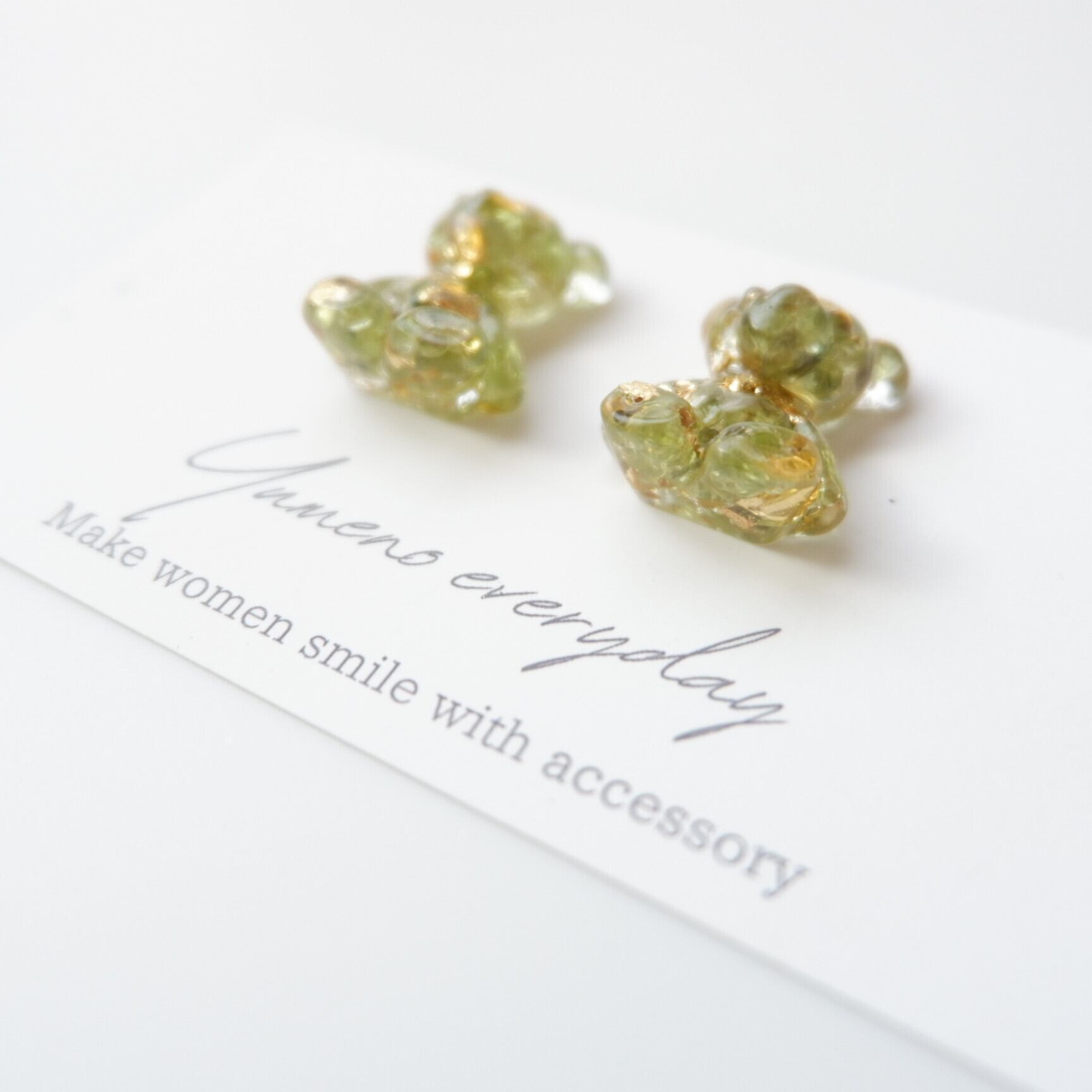 素材:金属、天然石ペリドットさざれ、金箔、レジン