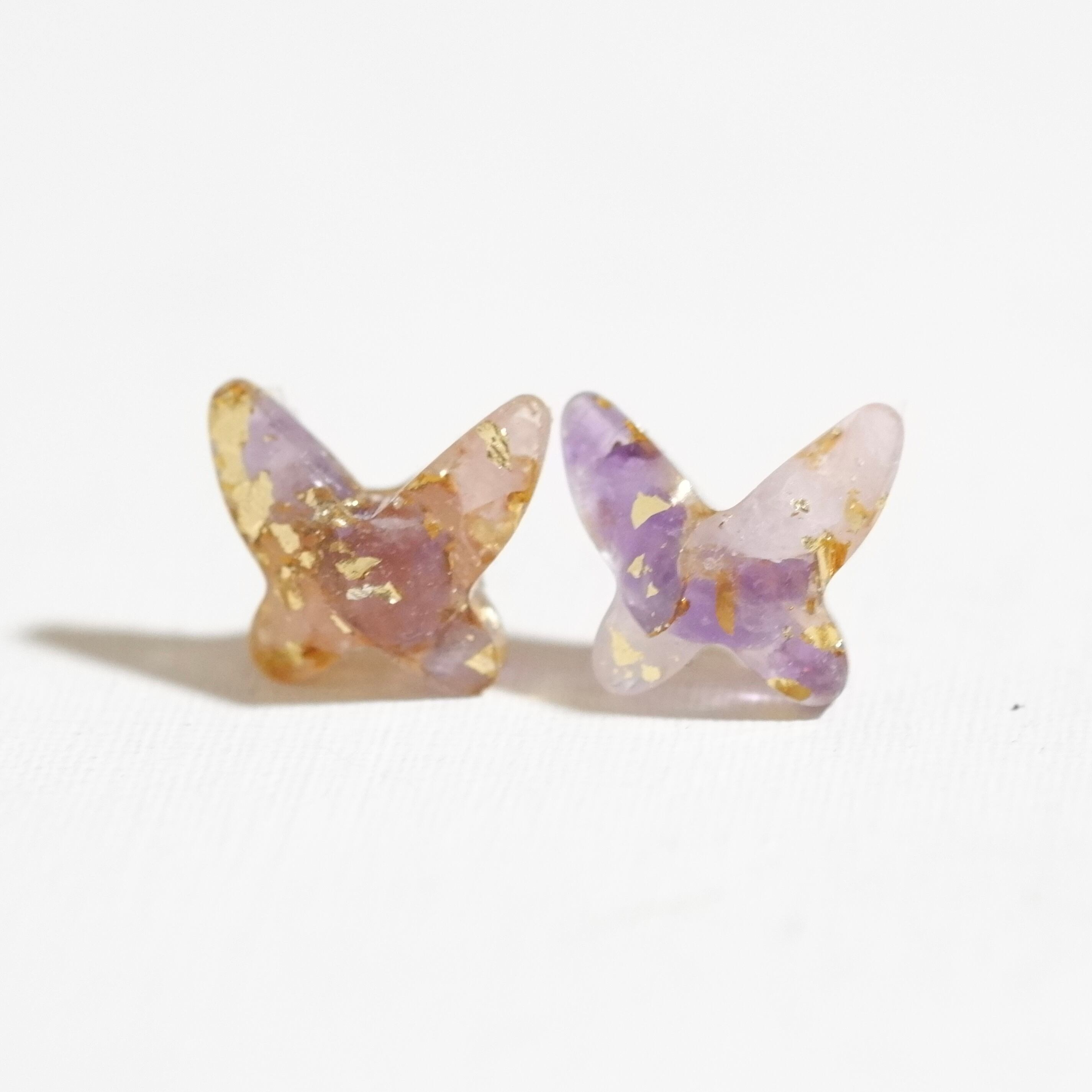 天然石のアメジスト、ローズクォーツのさざれと金箔を美しいジュエリーカットの蝶々に閉じ込めた大人女性のための蝶々アクセサリーです。
