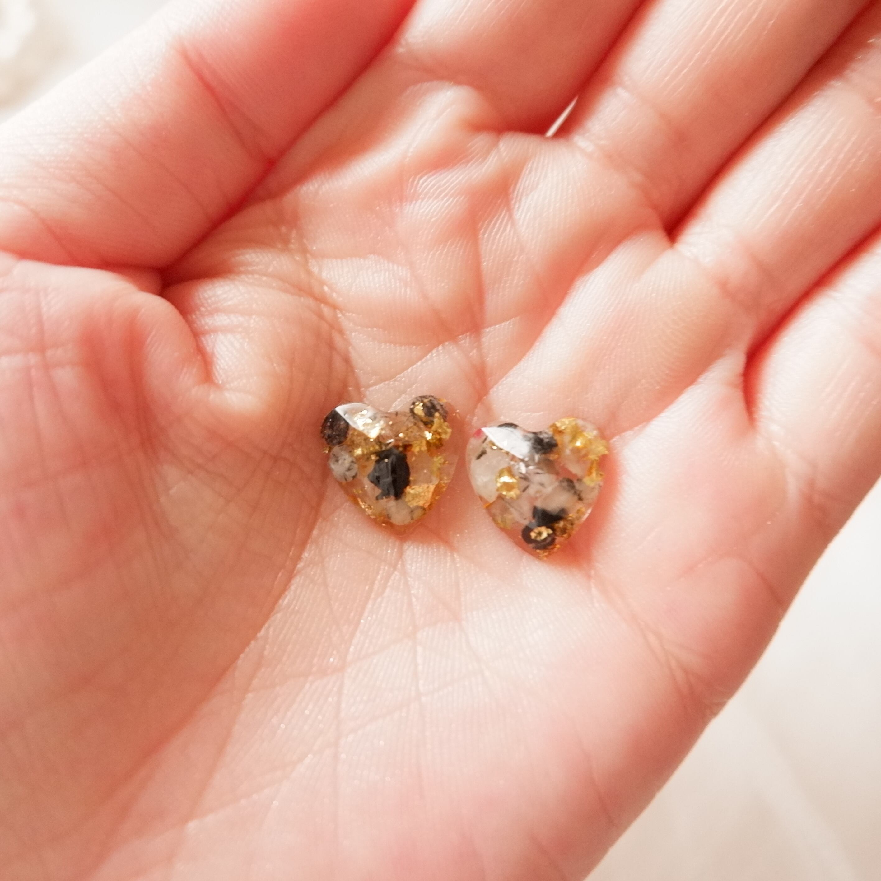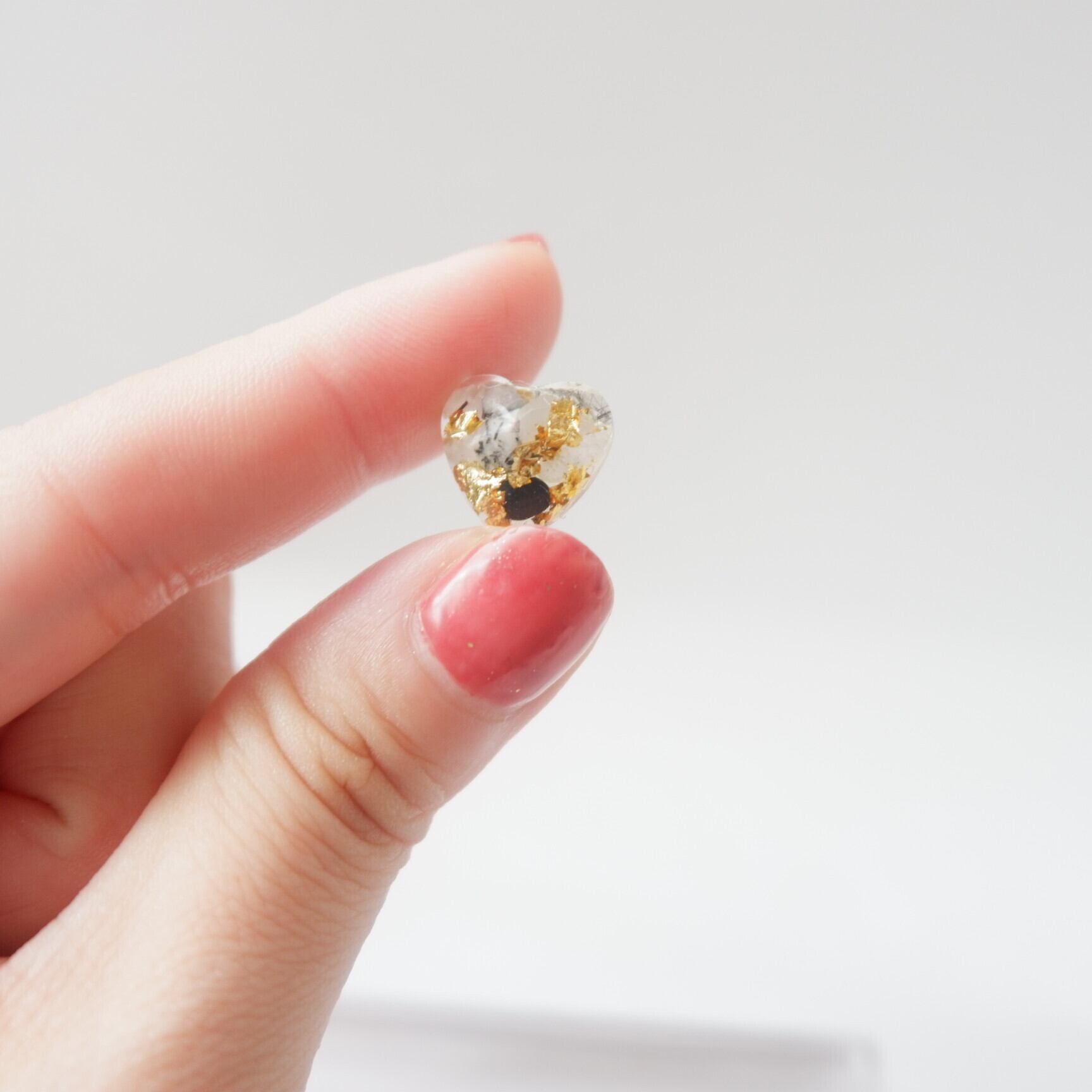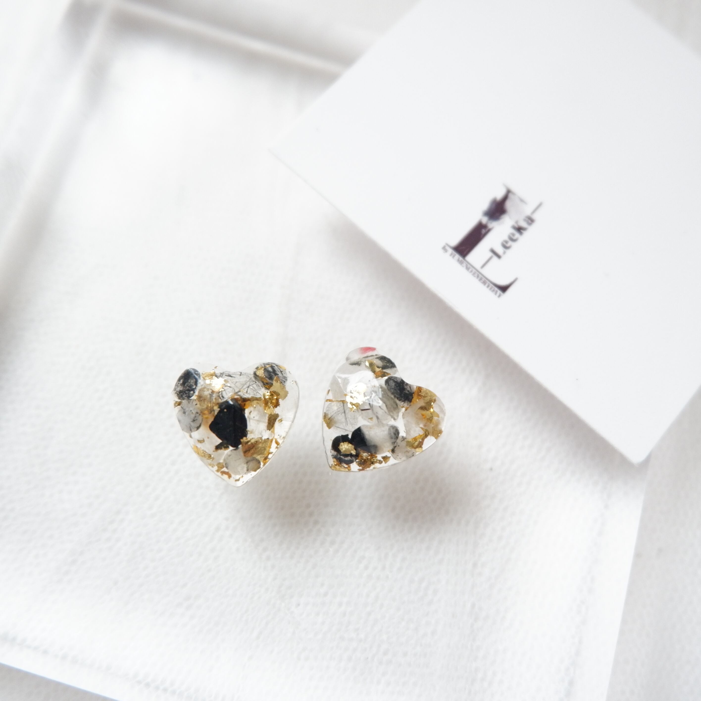 天然石のブラックルチルクォーツのさざれと金箔をハートのジュエリーに仕上げました。