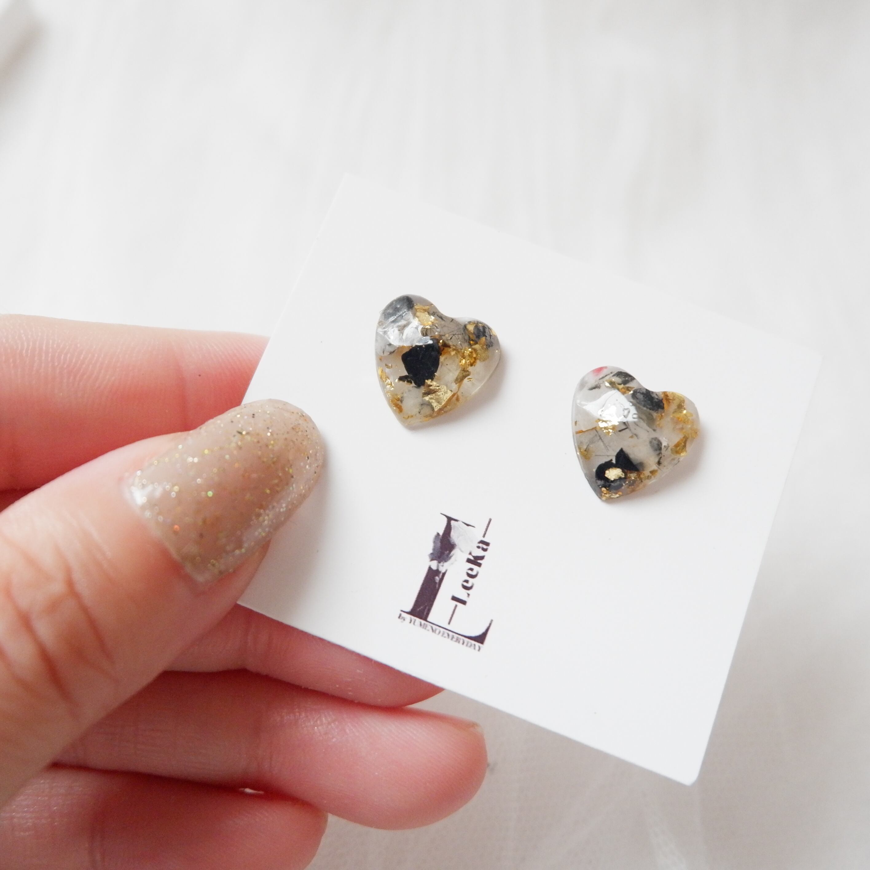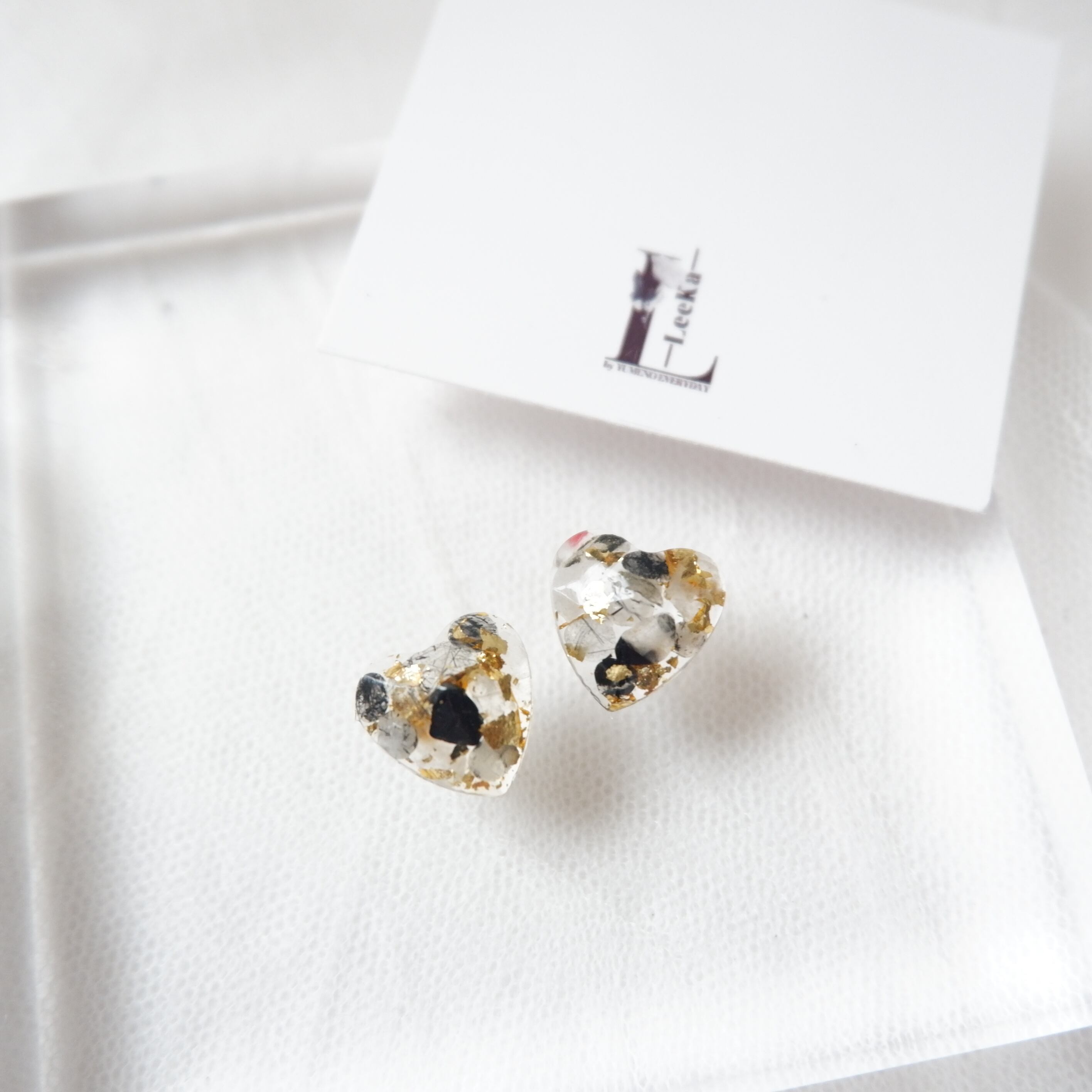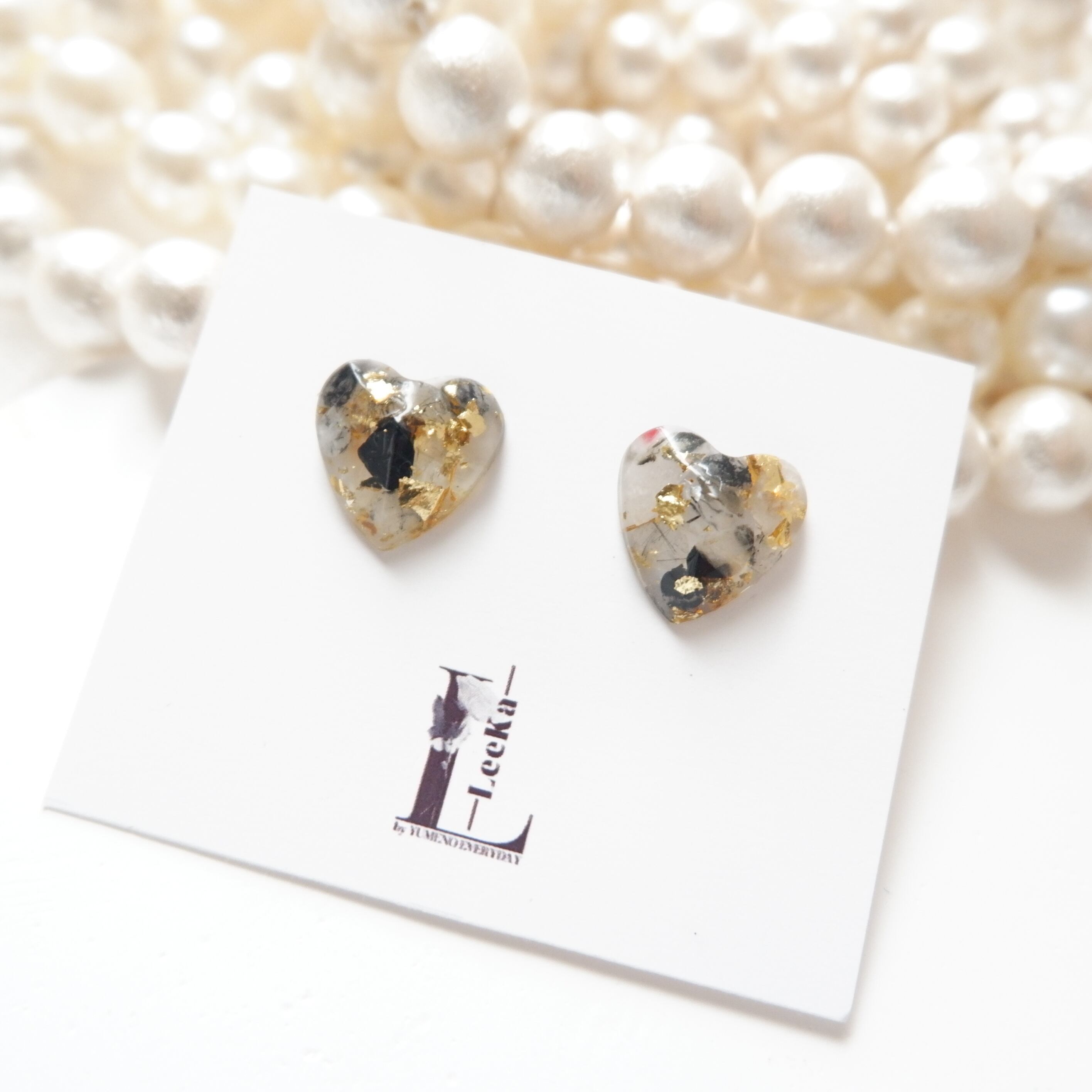 天然石のブラックルチルクォーツのさざれと金箔をハートのジュエリーに仕上げました。