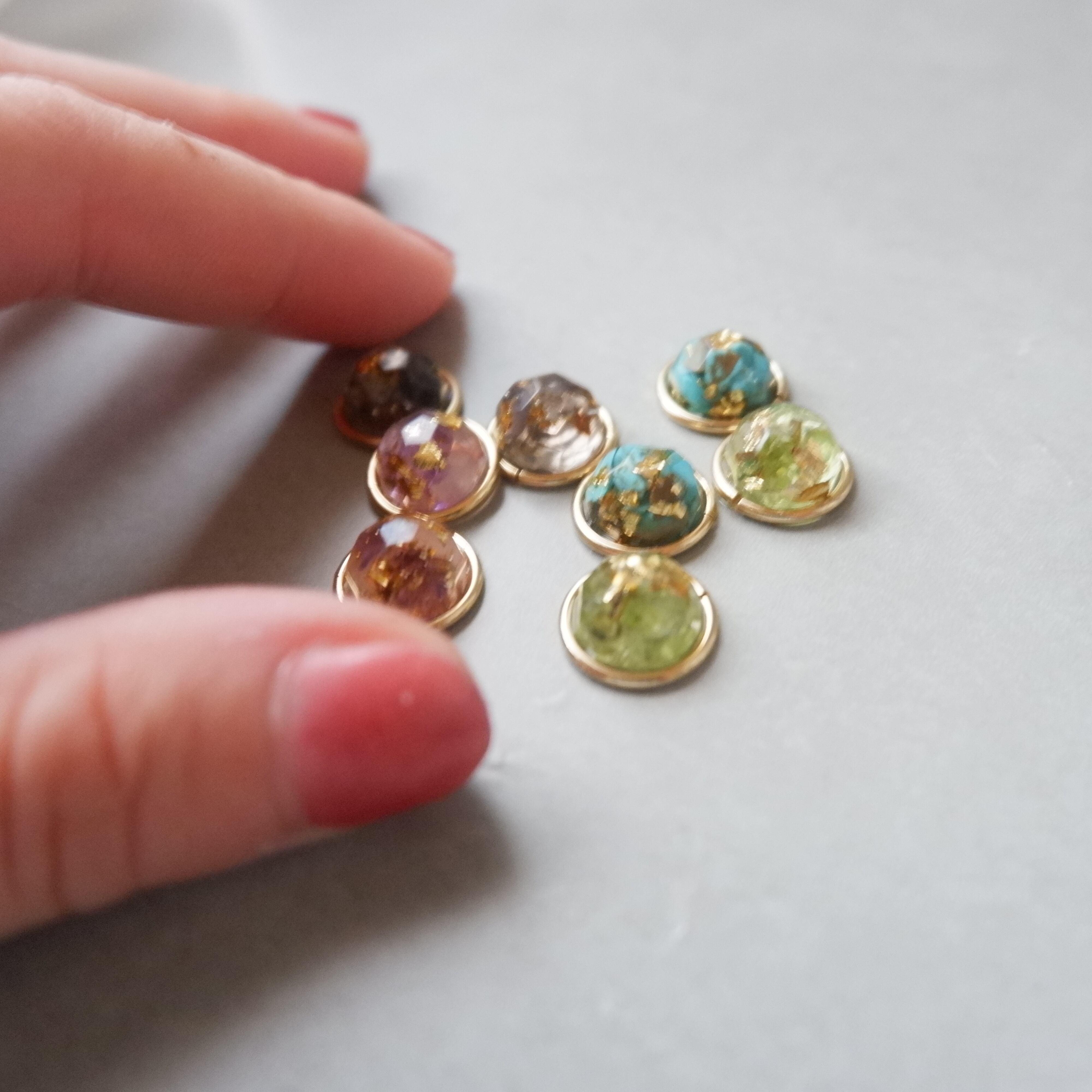 ご注文後にお選びいただいたパーツを接着後にレジンでツヤツヤにコーティングします。