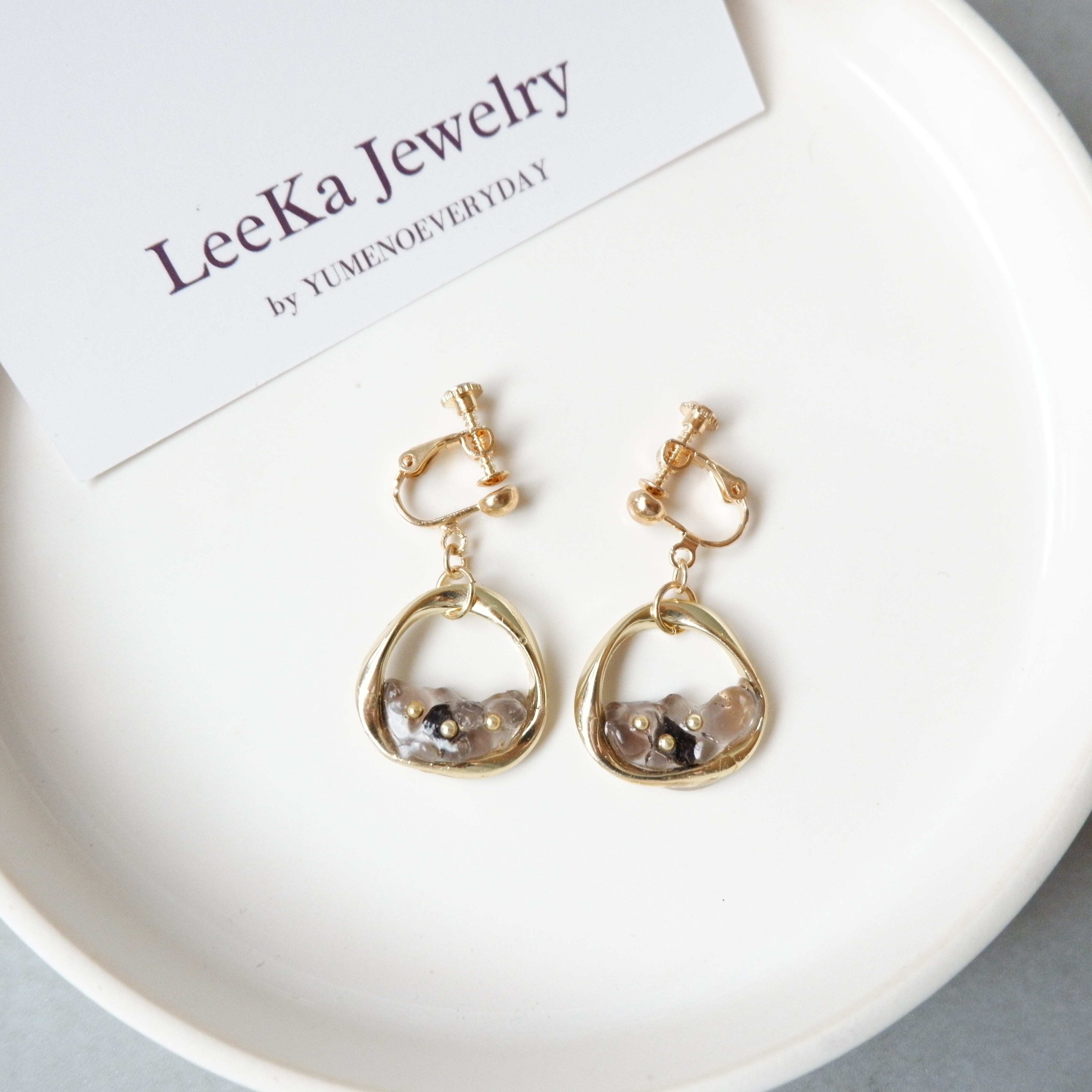 天然石のスモーキークォーツのさざれをデザインされたフレームの半分に浮くようなハーフムーンにデザインにしたイヤリング・ピアス♡