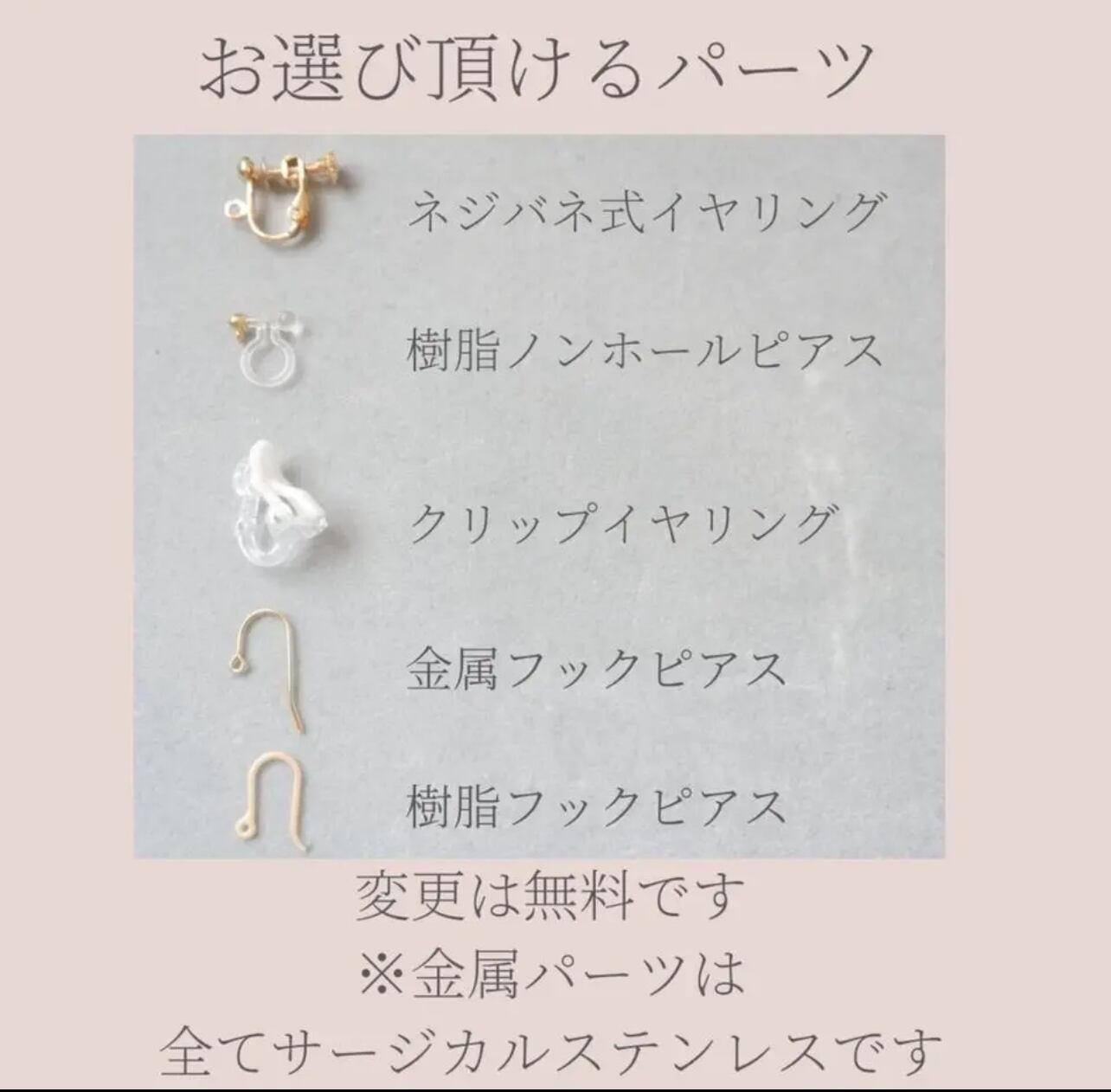 ネジバネ式イヤリング、樹脂ノンホールピアス、クリップイヤリング、金属フックピアス、樹脂フックピアスの中からパーツを選択欄からお選び下さい。