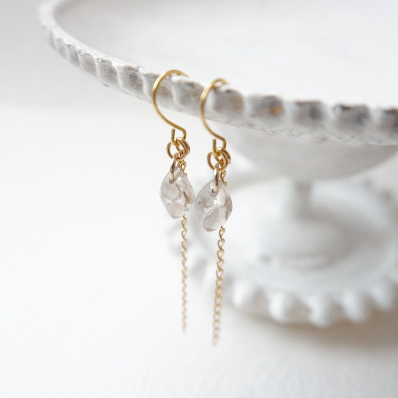 天然石のスモーキークォーツの小さなドロップに繊細チェーンをデザインしたイヤリング・ピアス♡