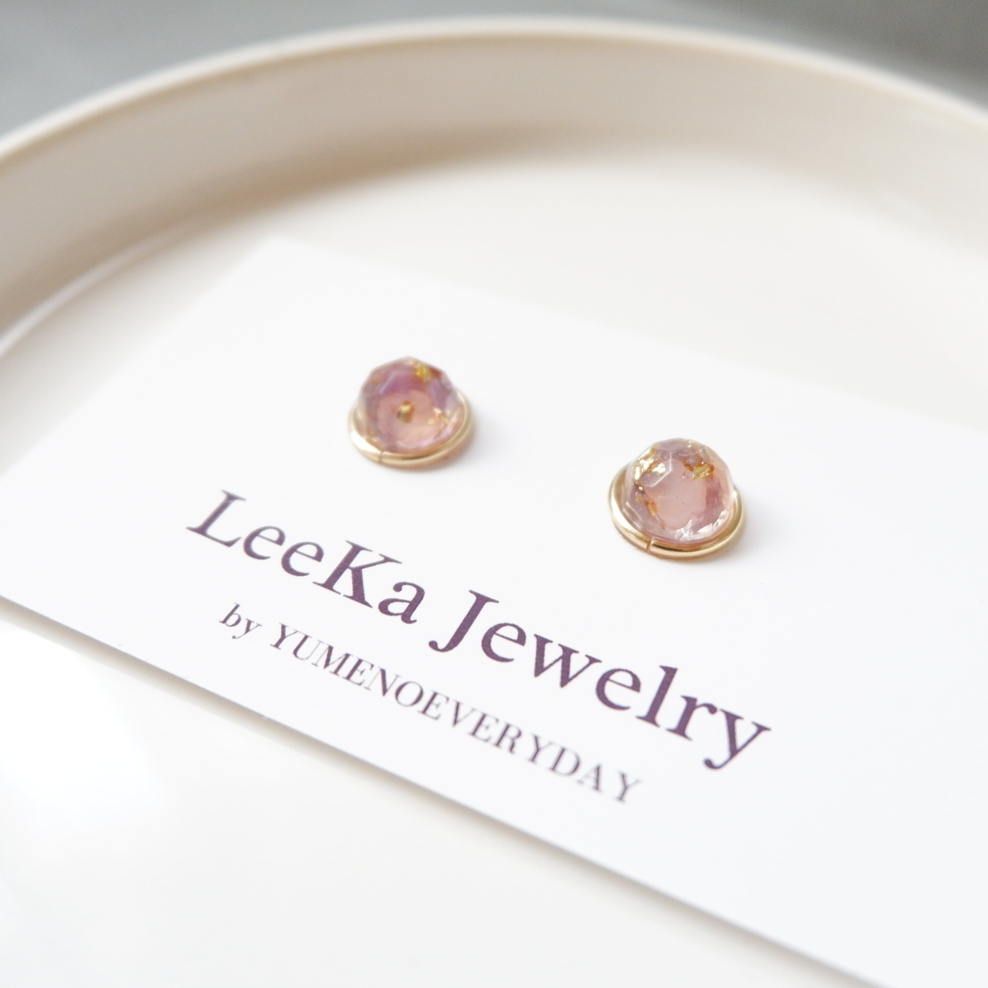 天然石のアメジスト、ローズクォーツのさざれ石と金箔を美しいジュエリーカットに閉じ込めています。