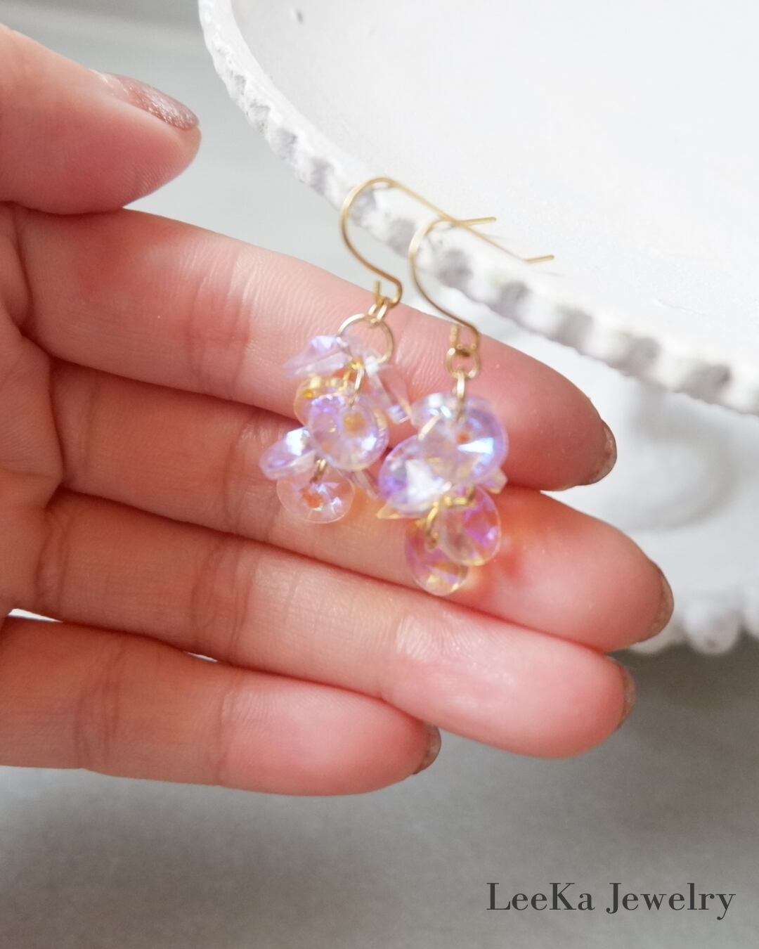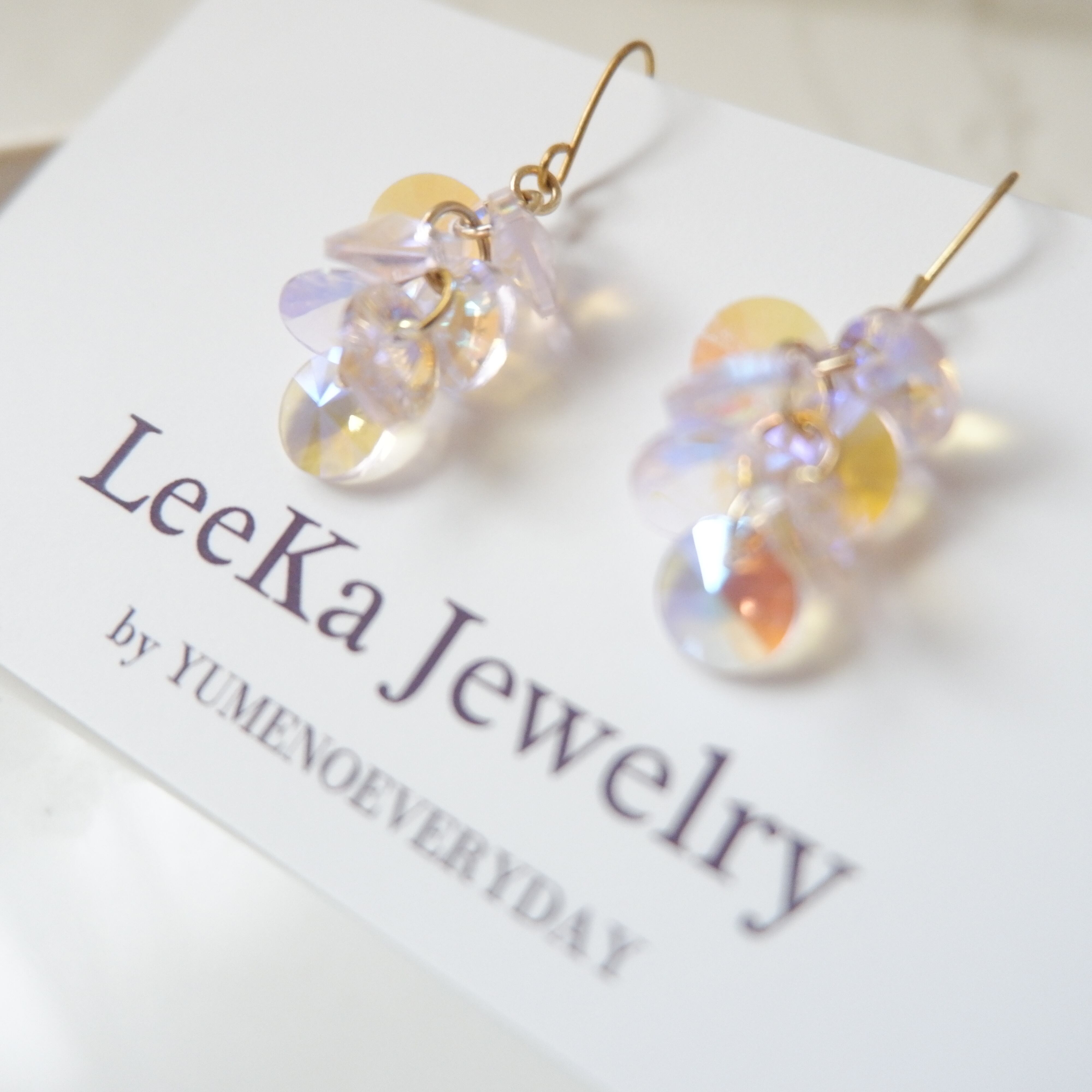 ヨーロッパから取り寄せた透明感のあるオーロラクリスタルガラスを贅沢に片耳7粒使ったまるで小さなシャンデリアのようなデザインです。