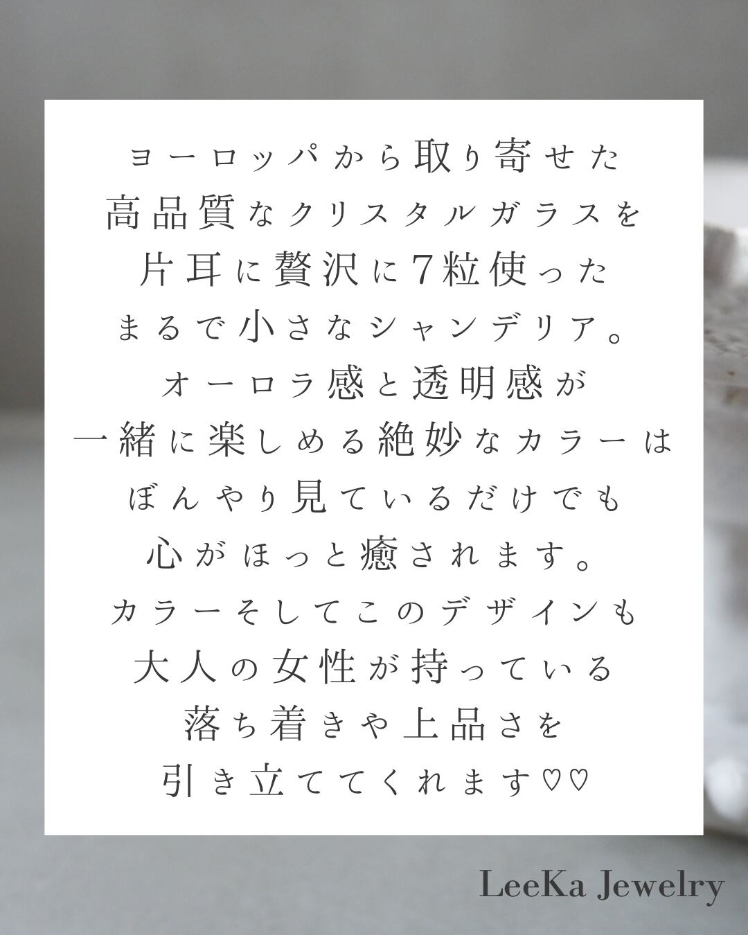 ヨーロッパから取り寄せた透明感のあるオーロラクリスタルガラスを贅沢に片耳7粒使ったまるで小さなシャンデリアのようなデザインです。