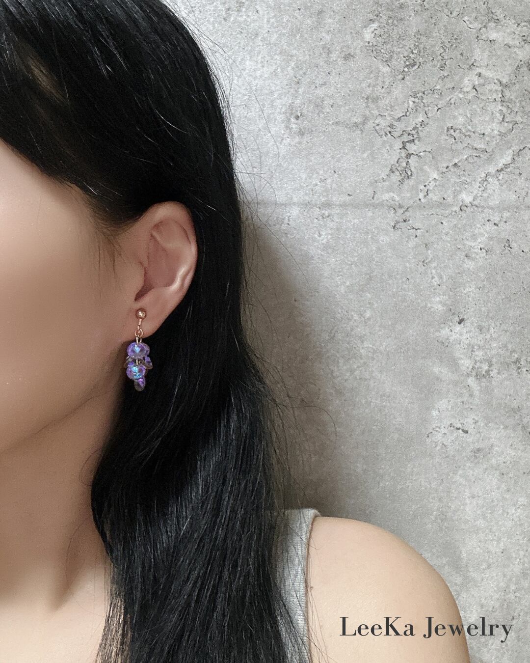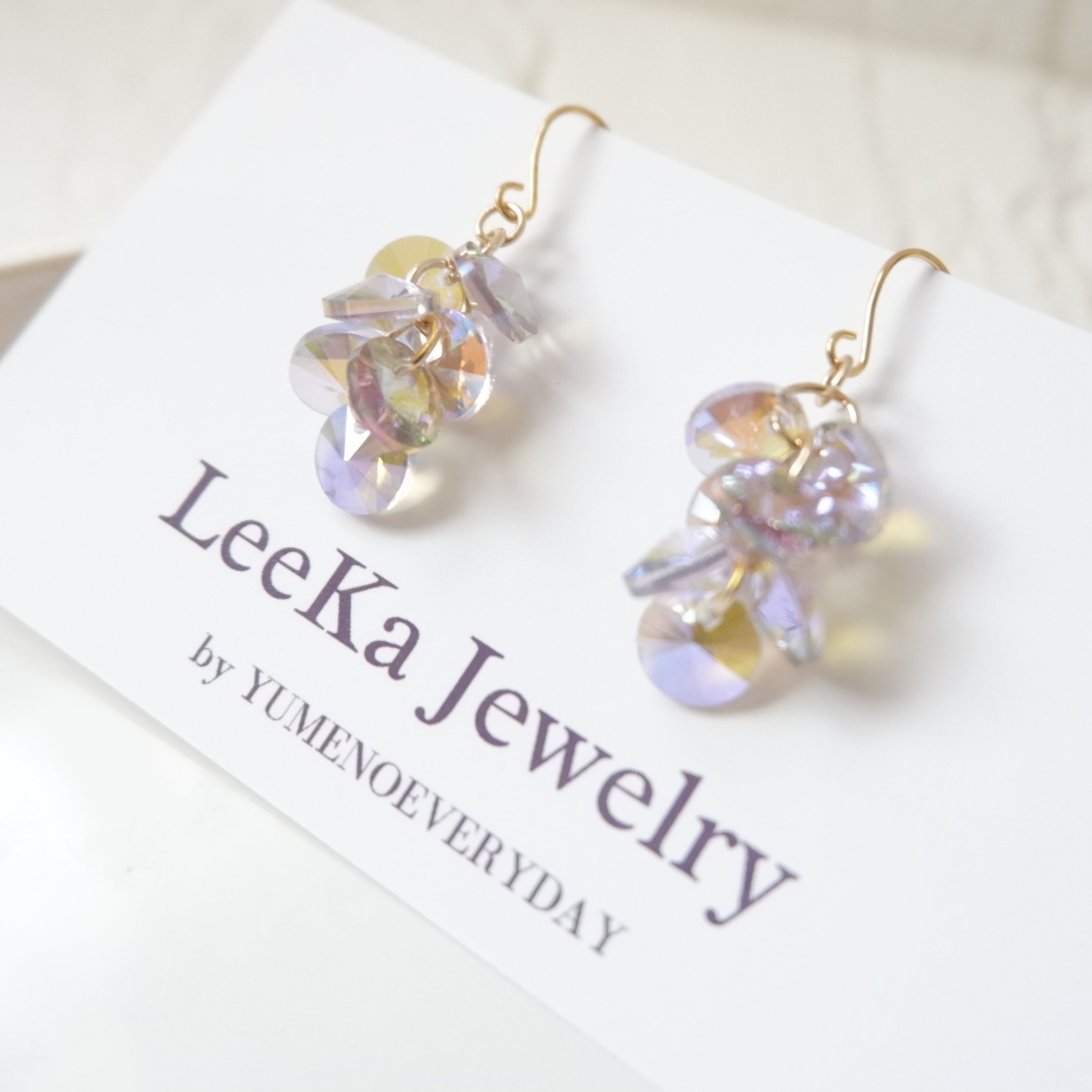 ヨーロッパから取り寄せた透明感のあるオーロラクリスタルガラスを贅沢に片耳7粒使ったまるで小さなシャンデリアのようなデザインです。