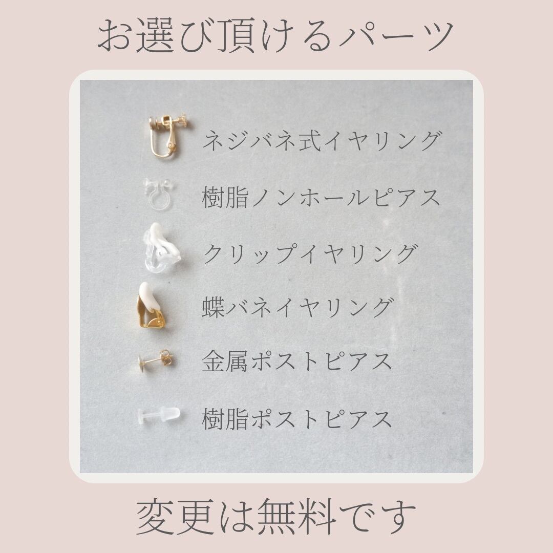 ネジバネ式イヤリング、樹脂ノンホールピアス、クリップイヤリング、蝶バネイヤリング、金属ポストピアス、樹脂ポストピアスからパーツがお選び頂けます。