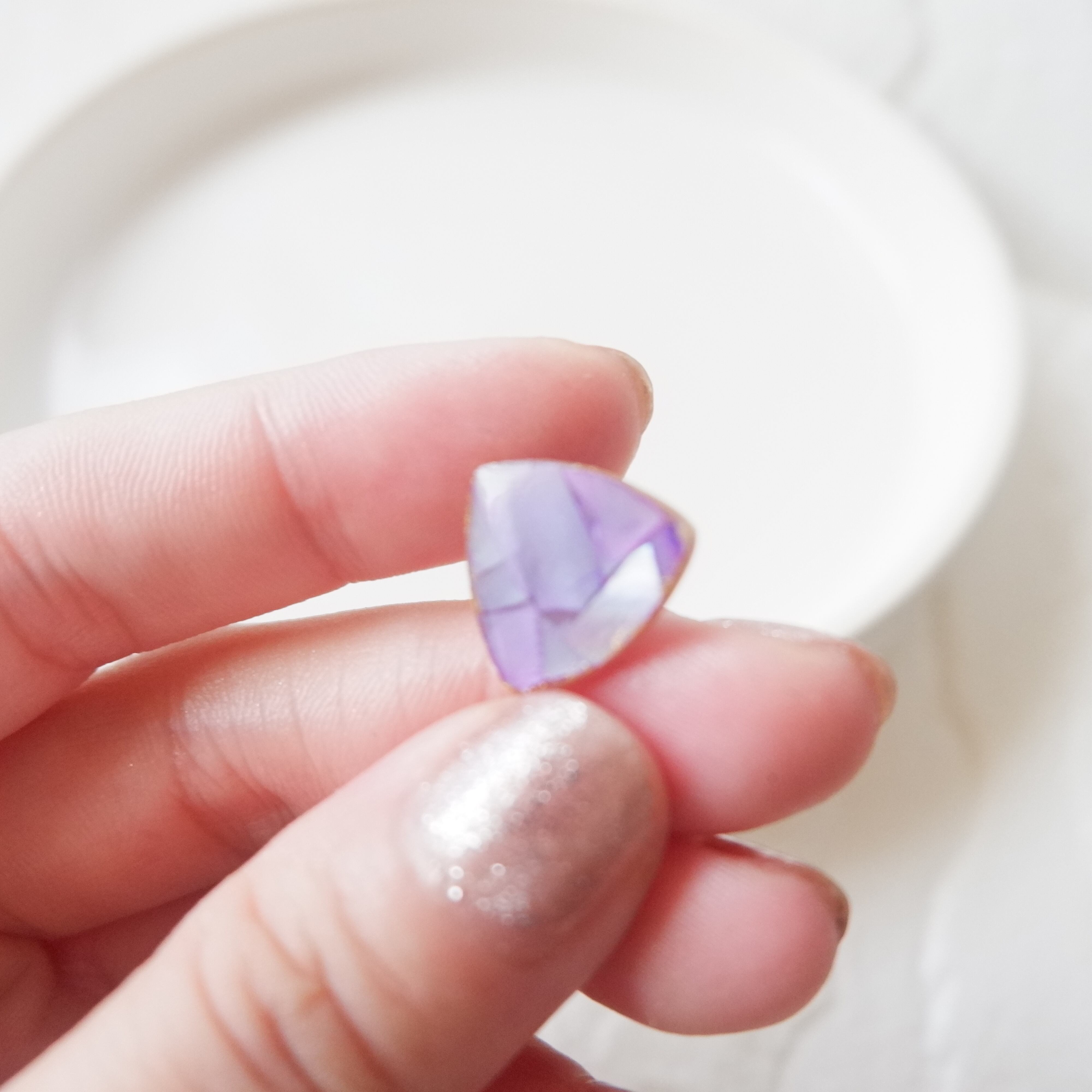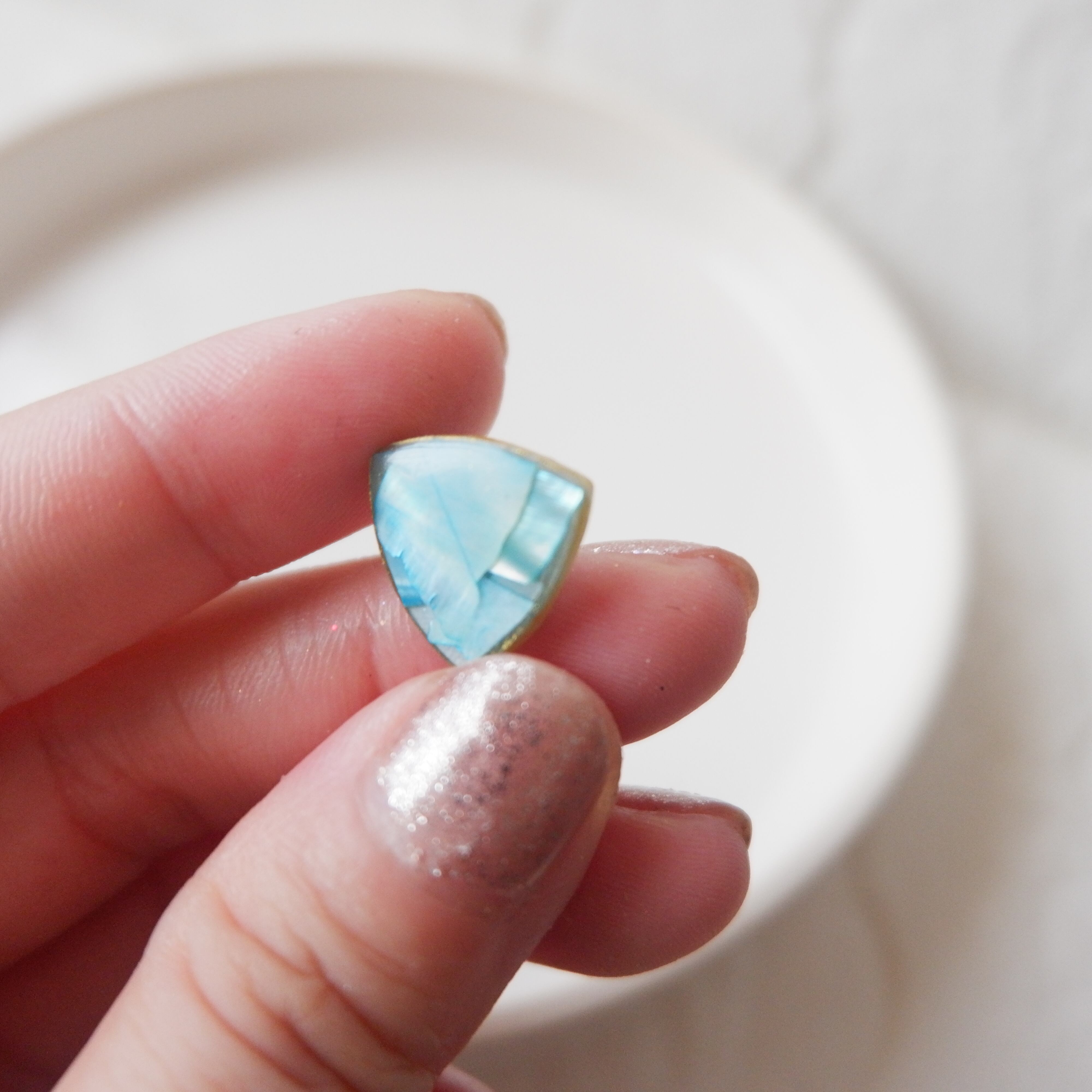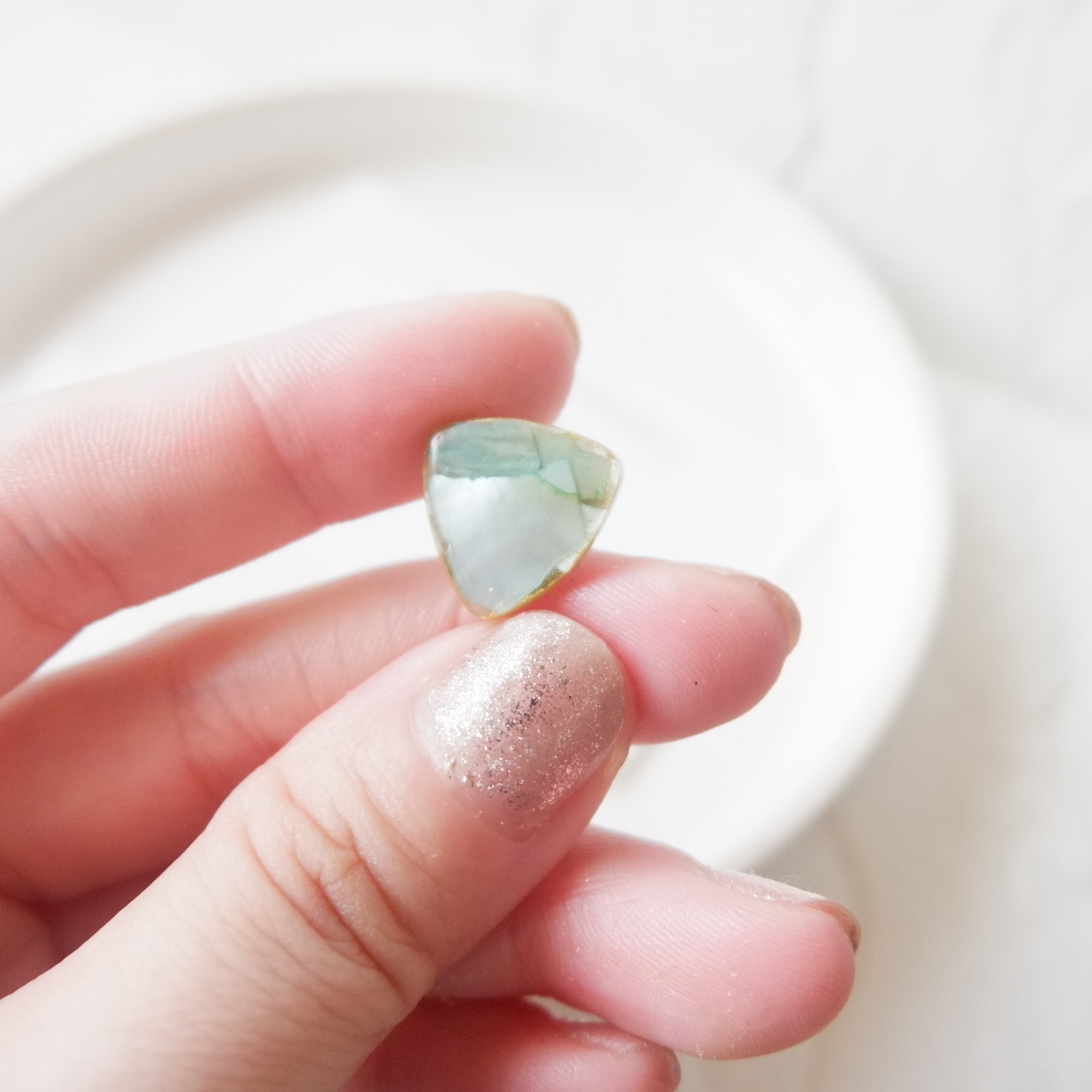 丸みのある三角形にシェルを敷きつめてふちをゴールドペイントしています。