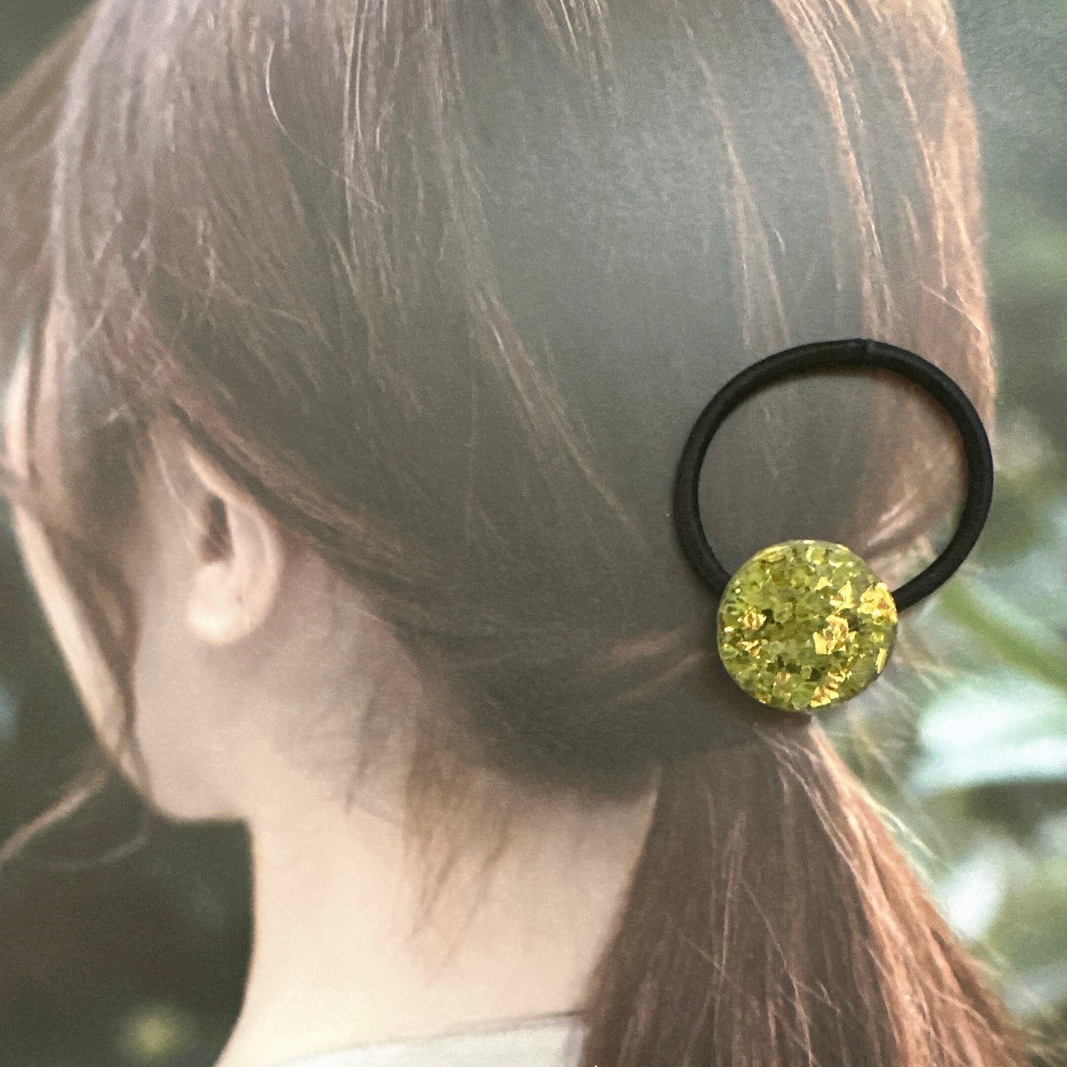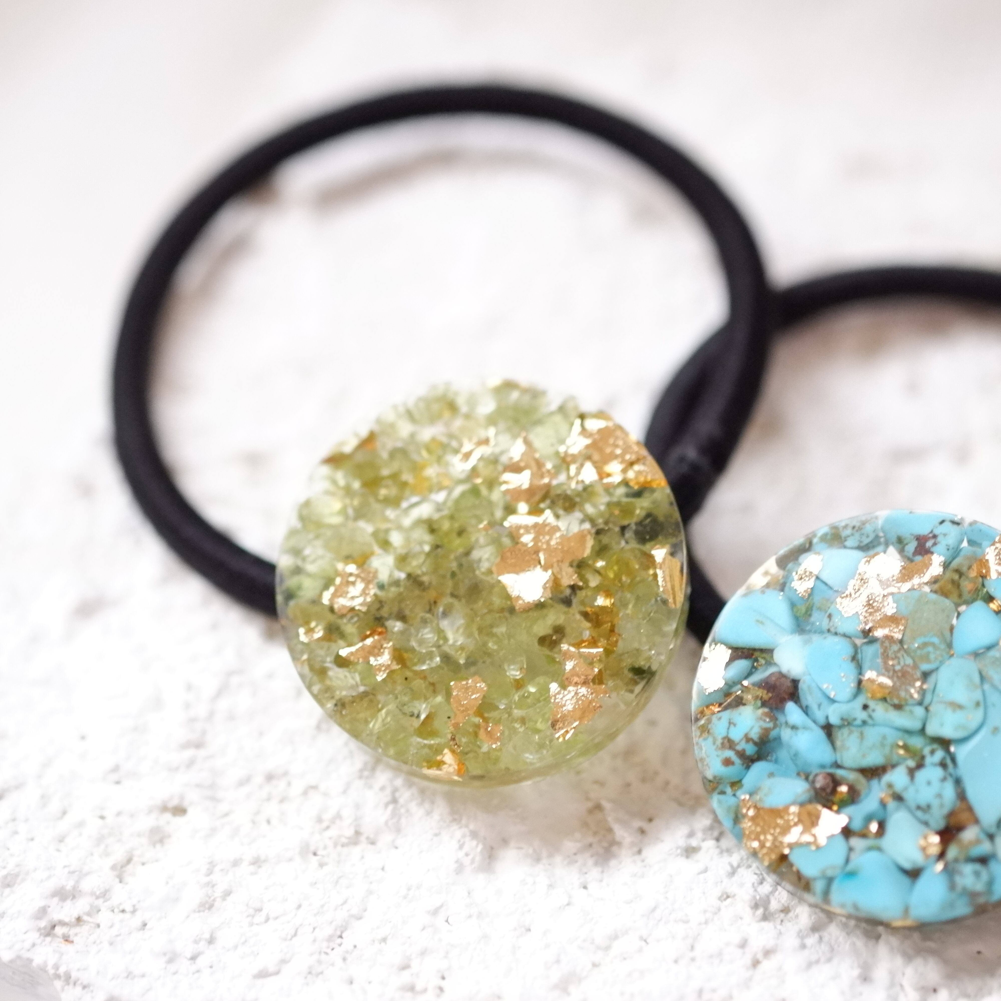 シンプルな丸い形に天然石のペリドットのさざれと金箔をたっぷり閉じ込めたヘアゴムです。