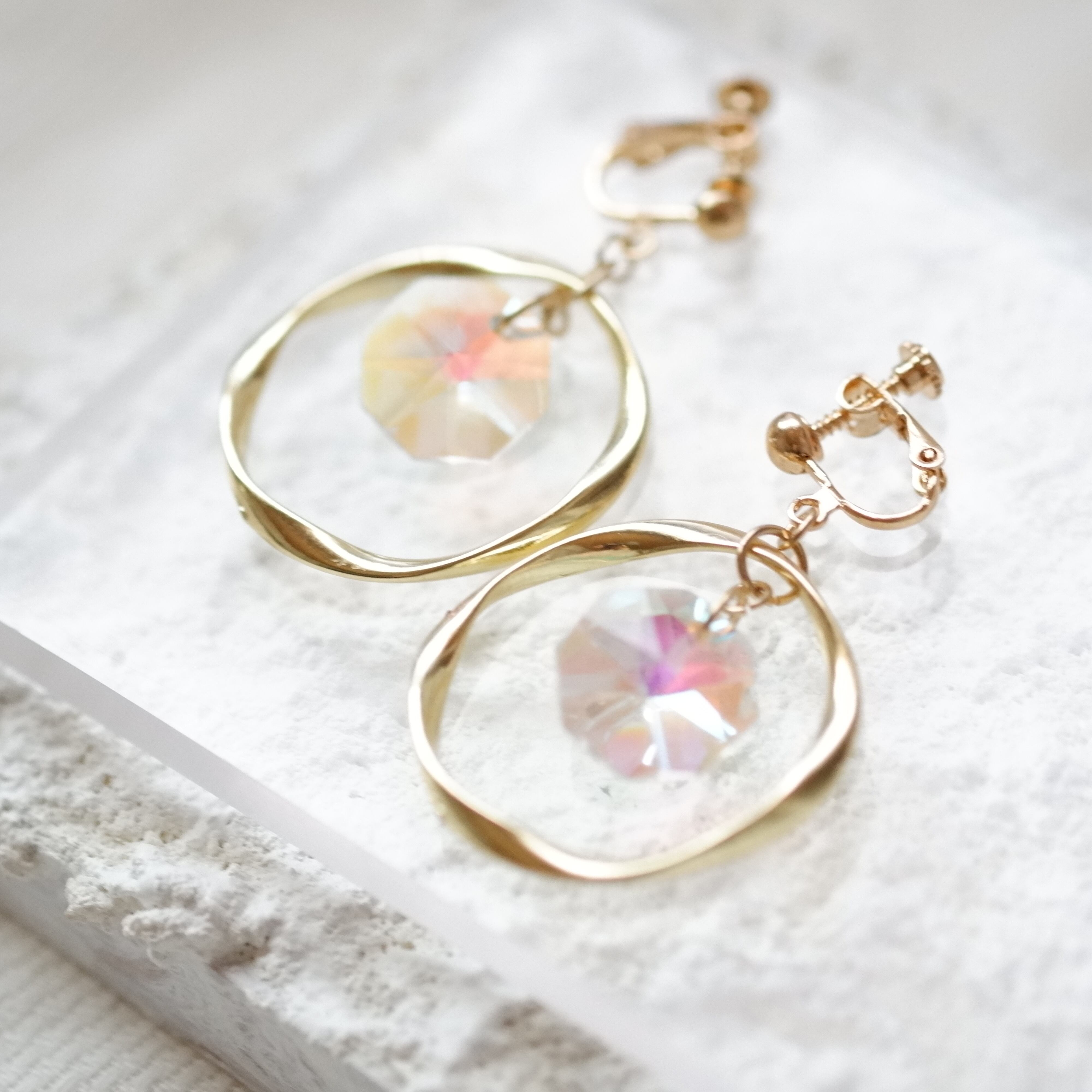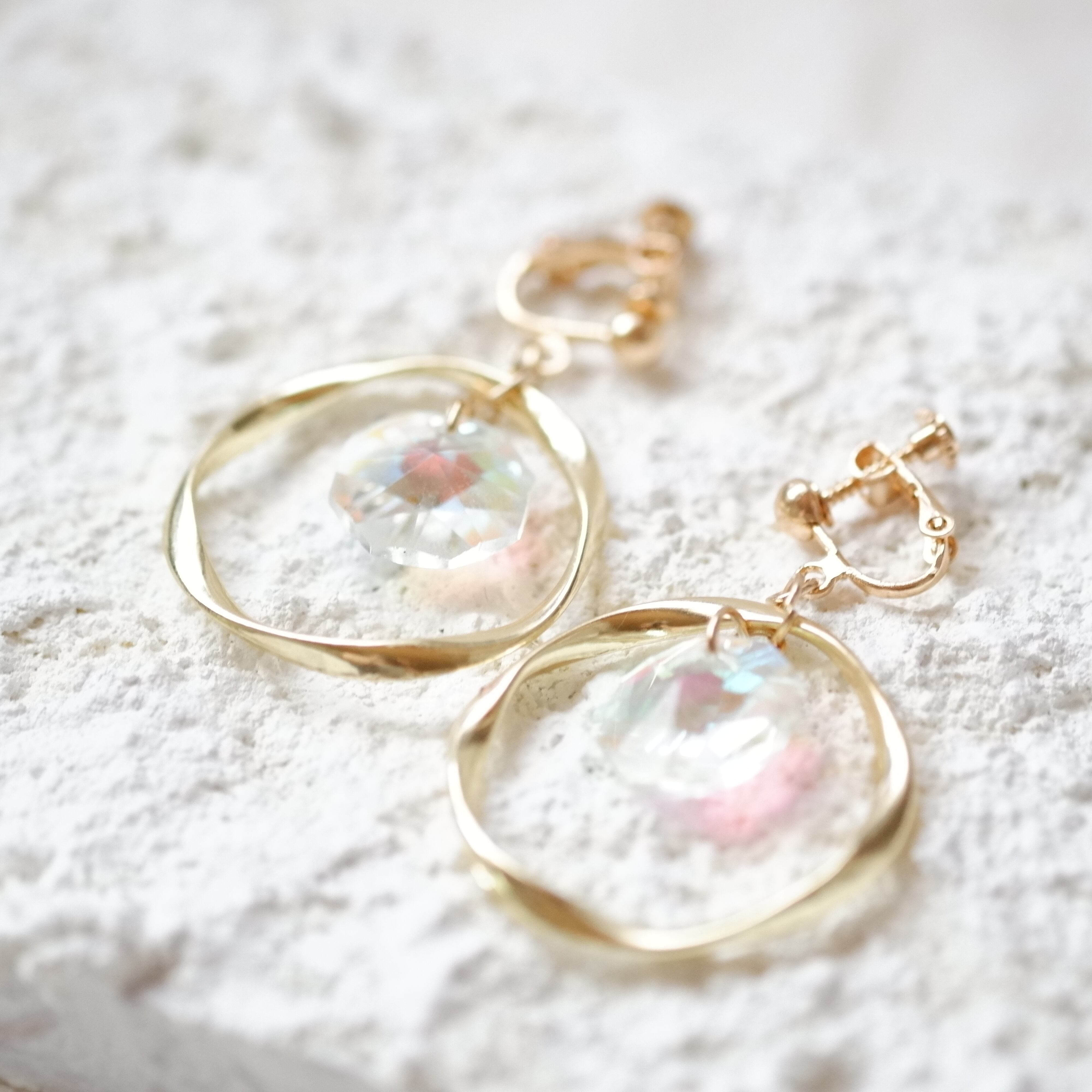 大きめのゴールドフープリングにヨーロッパから取り寄せた透明感のあるオーロラクリスタルガラスを使ったゆらゆら揺れる大ぶりなデザインです。