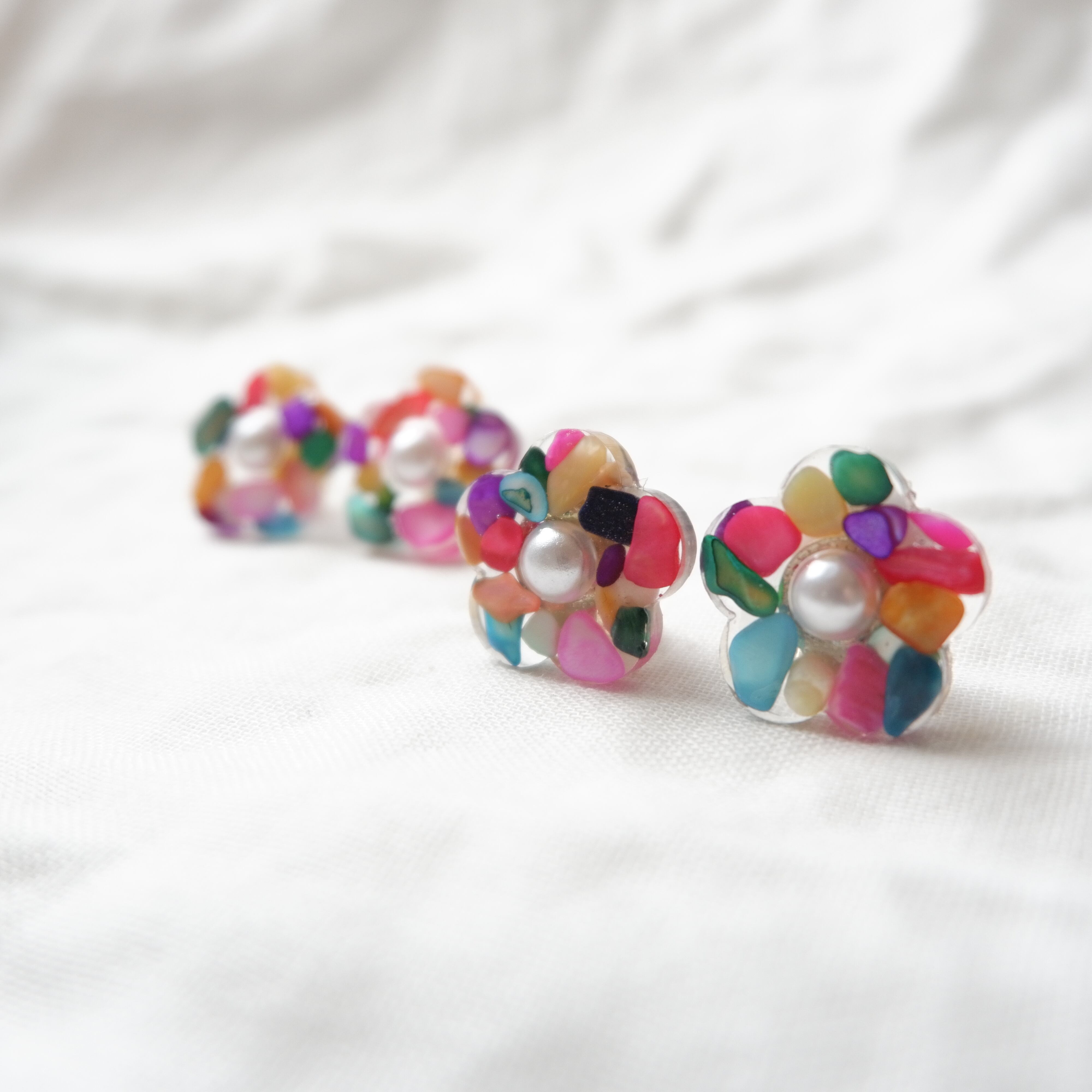 カラフルなシェル(貝殻)のお花のジュエリー。