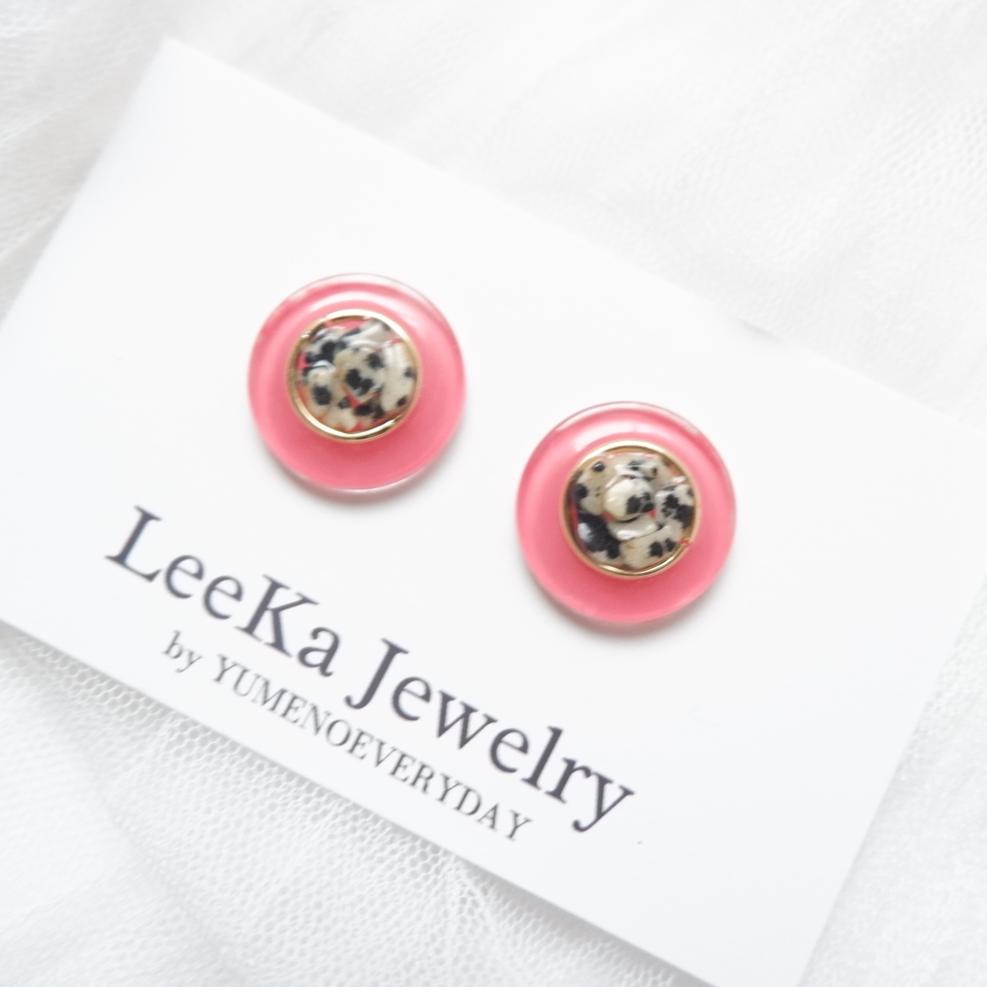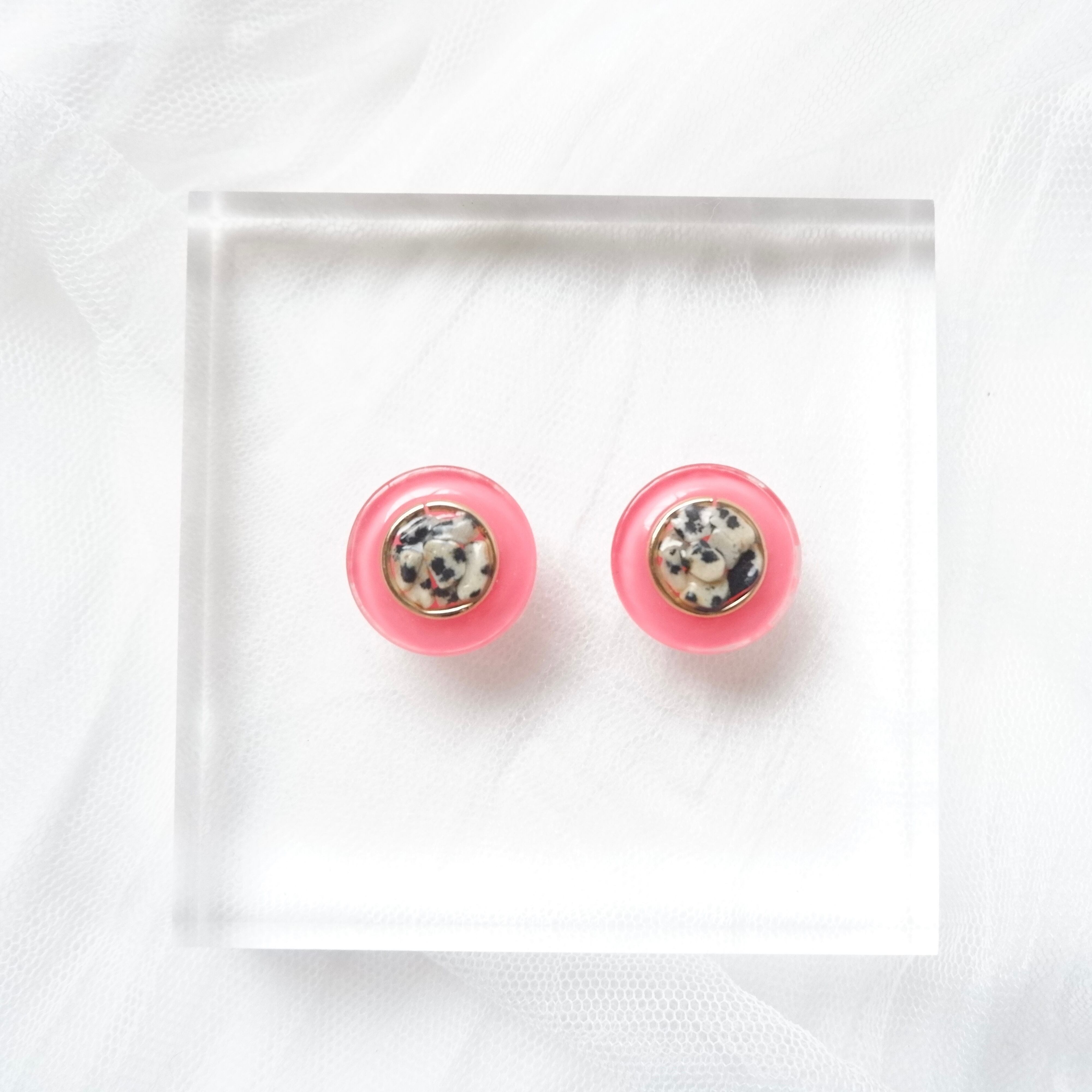 天然石ダルメシアンジャスパーのさざれをボタン風にデザインしたお耳飾りです♡